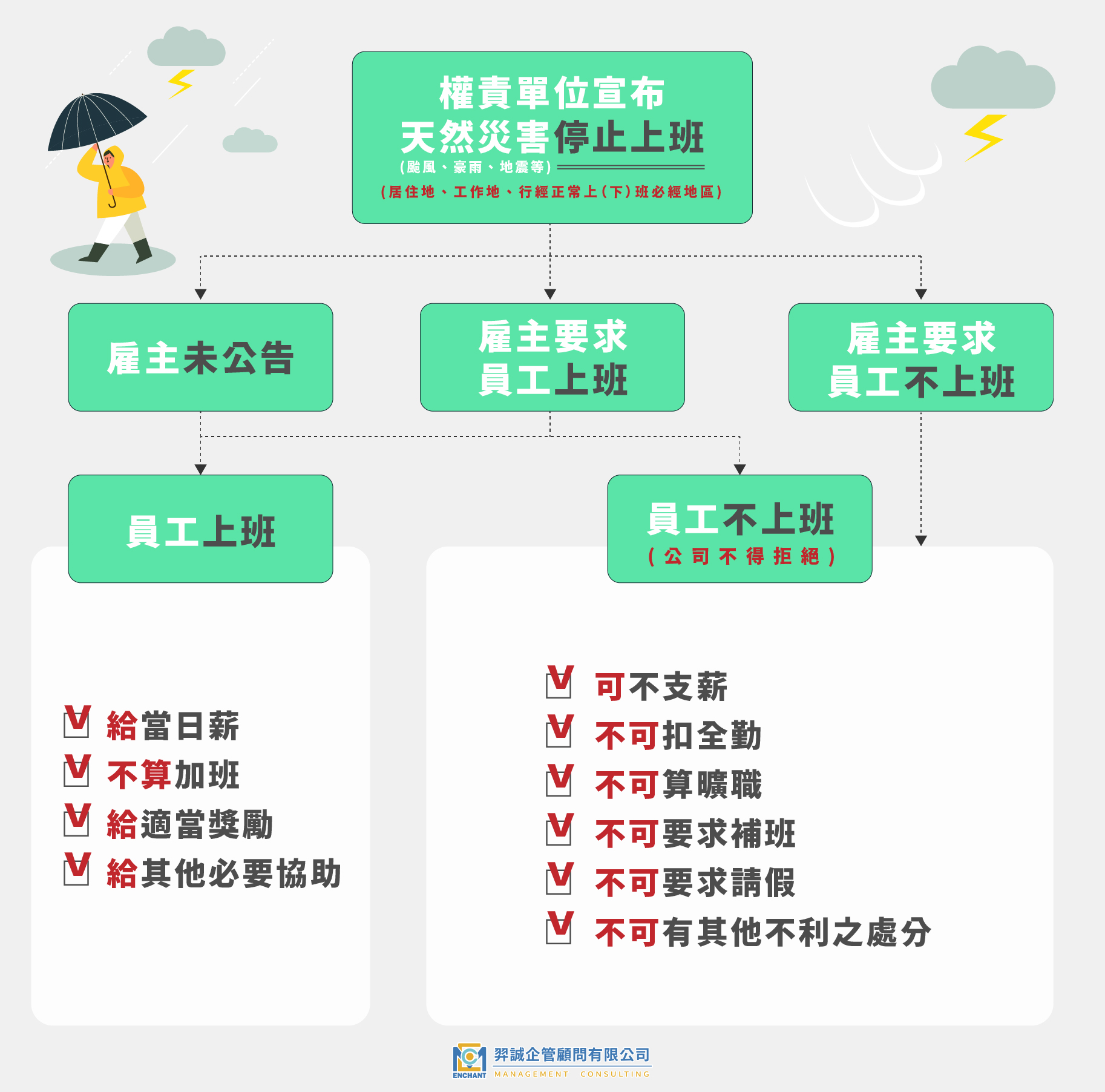 - 於風雨季節前預先備妥「天然災害出勤處理公告」,明確說明出勤安排、薪資規則、交通補助等事項,避免勞資爭議。