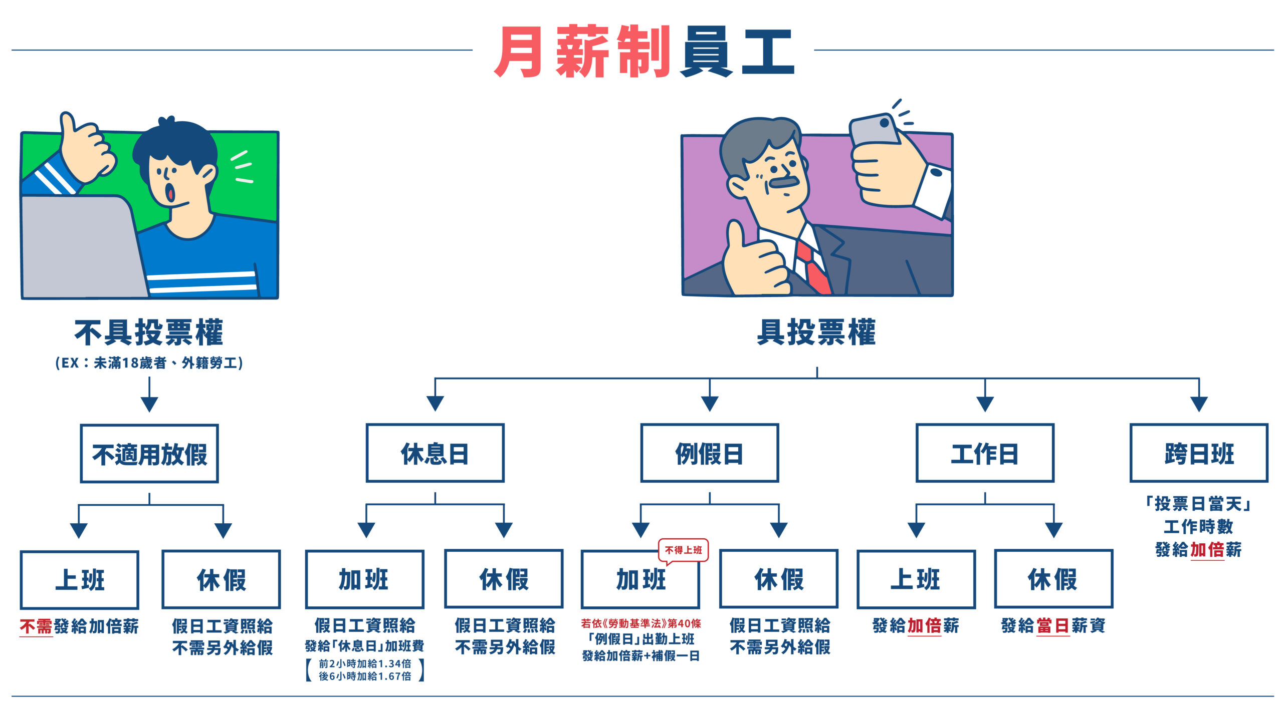 - 上班:即使投票日勞資雙方約定出勤上班,員工出勤仍可領取【加倍薪資】。