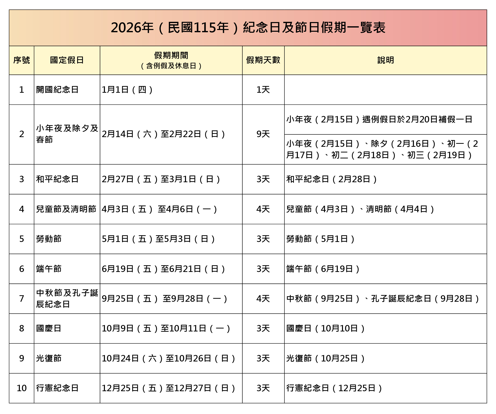 ①本表係依行政院人事行政總處公布之政府行政機關辦公日曆表所制定。