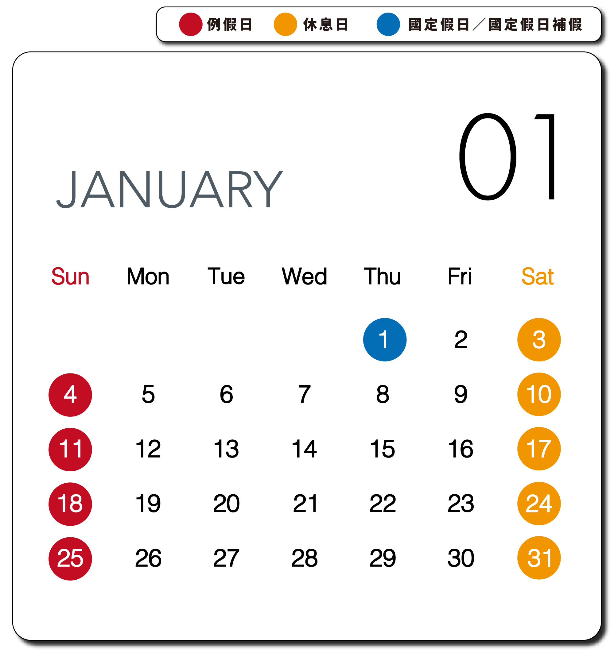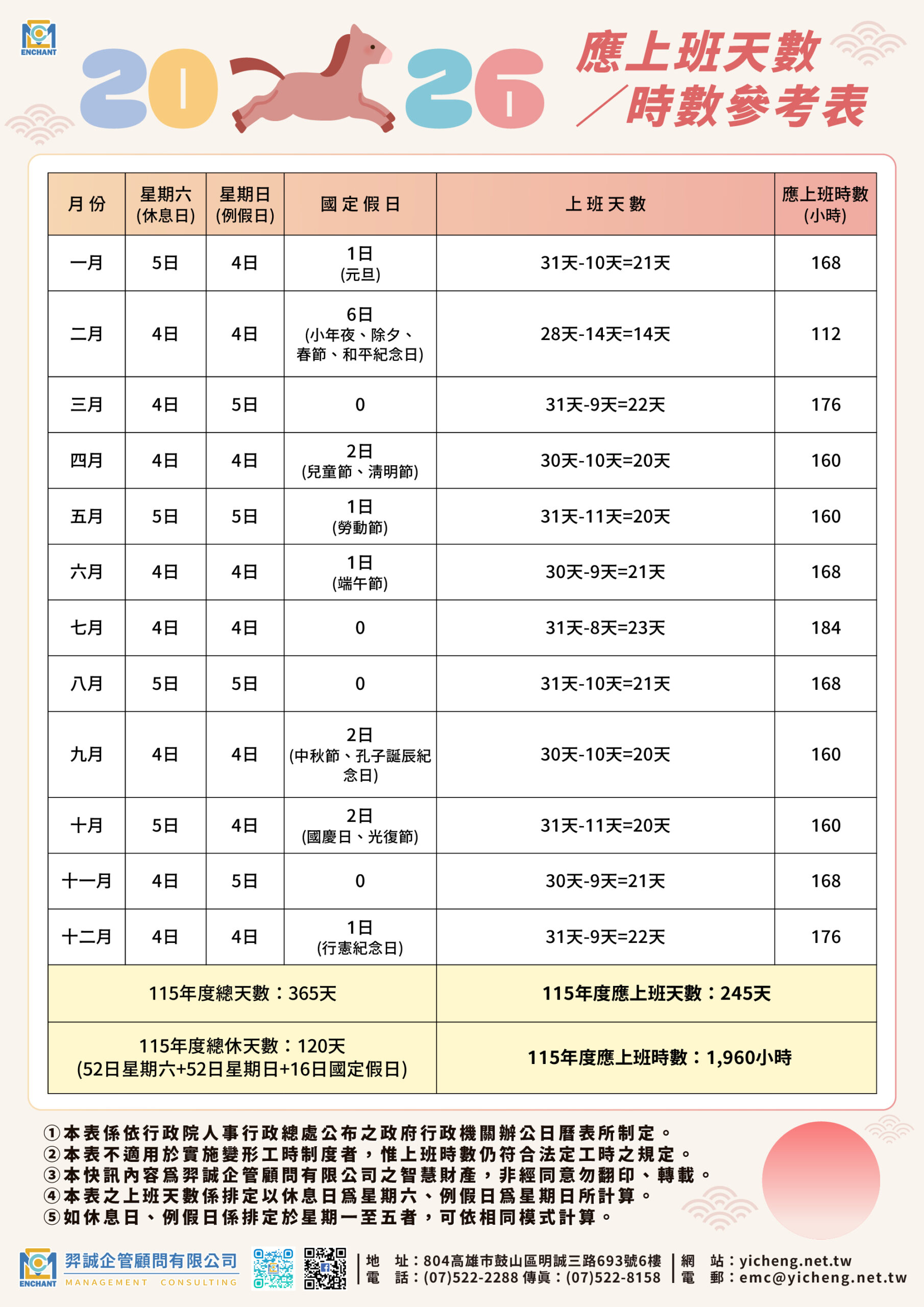 羿誠企管彙整上述行事曆製成企業版行事曆;列出放假日、出勤計算加班費依據、補班以及國定假日補假內容,讓企業有參酌的依據。