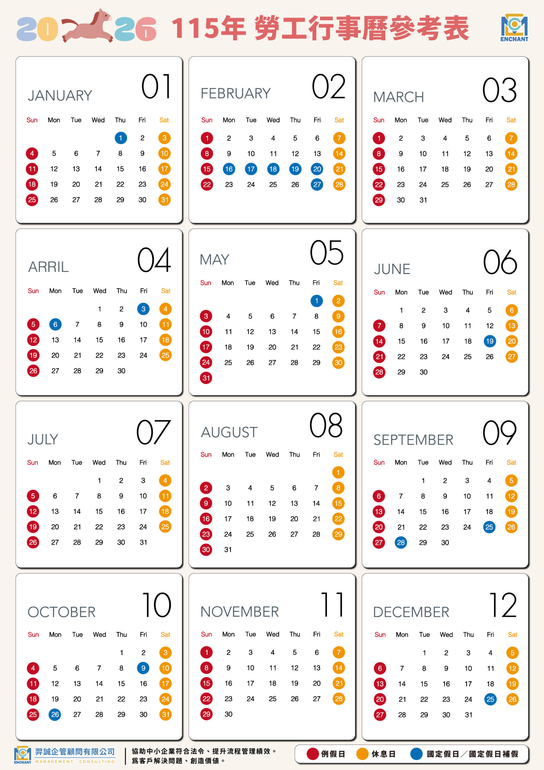 2026年(115年)勞工行事曆(參照人事行政總處行事曆)
