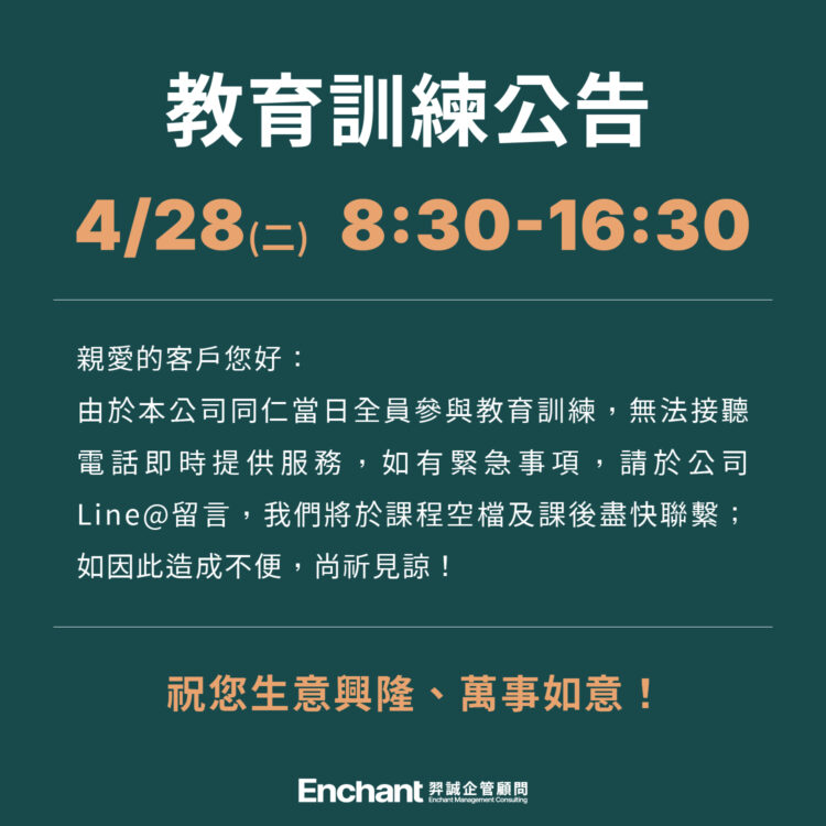 親愛的客戶您好: 由於本公司同仁當日全員參與教育訓練,無法接聽電話即時提供服務,如有緊急事項,請於公司Line…