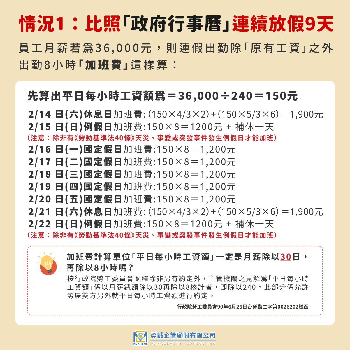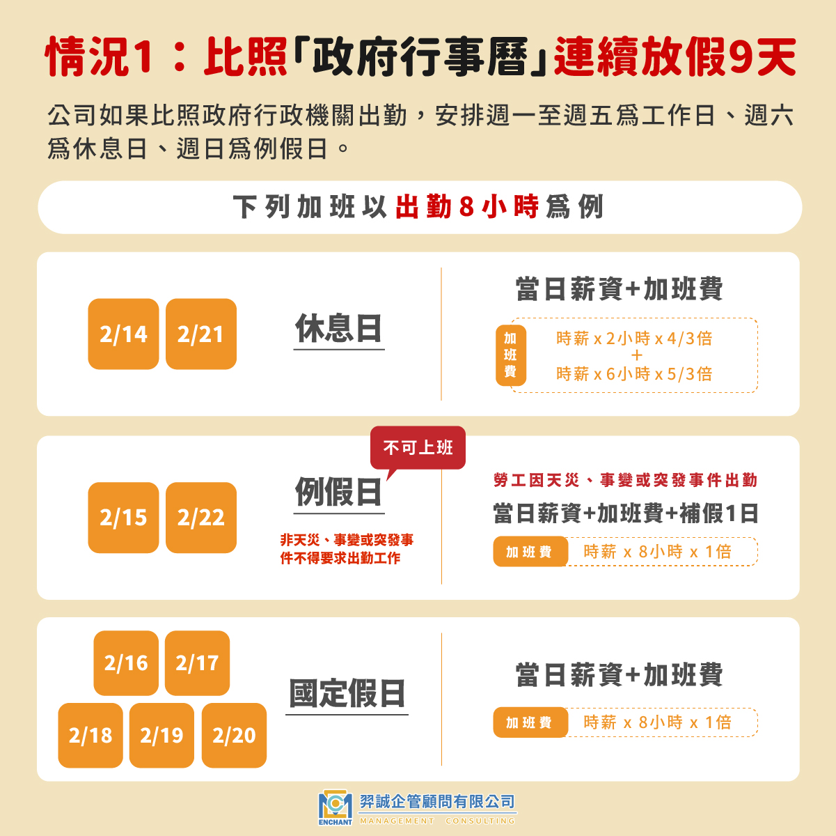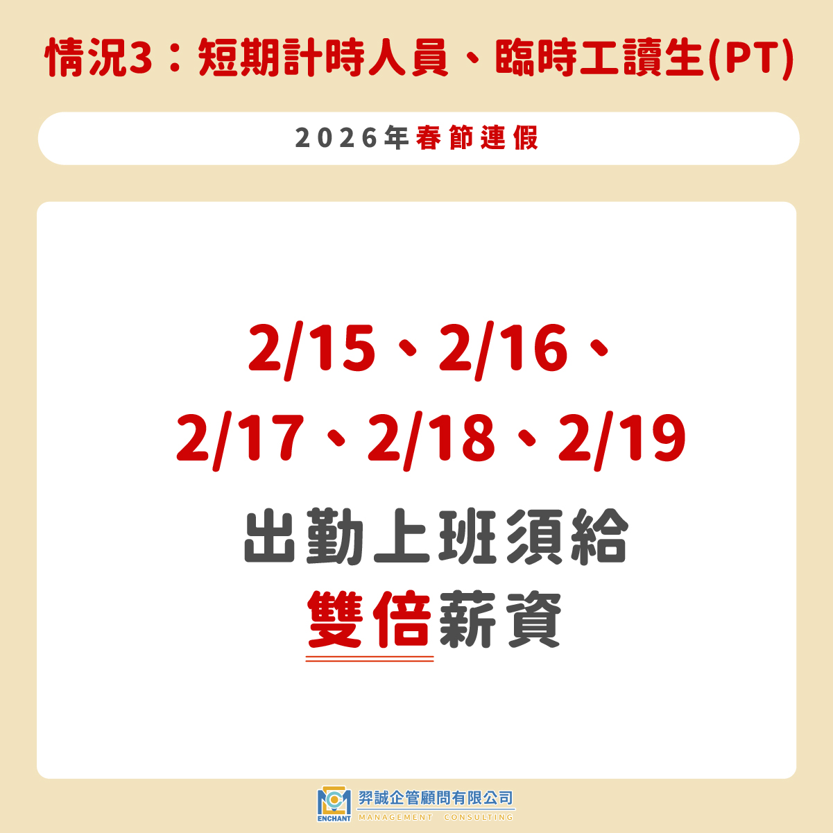 ✅其中2/15、2/16、2/17、2/18、2/19為「國定假日」,若安排臨時工、打工族、工讀生支援工作須給雙倍薪(每小時基本工資×2以上)。