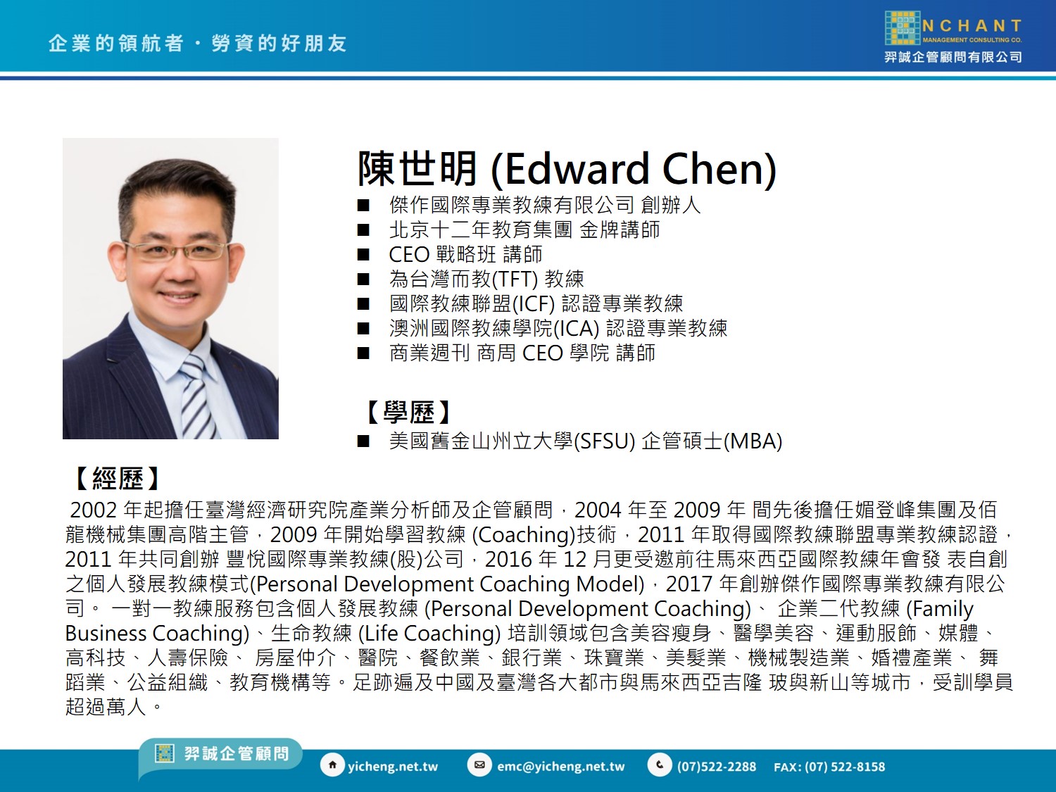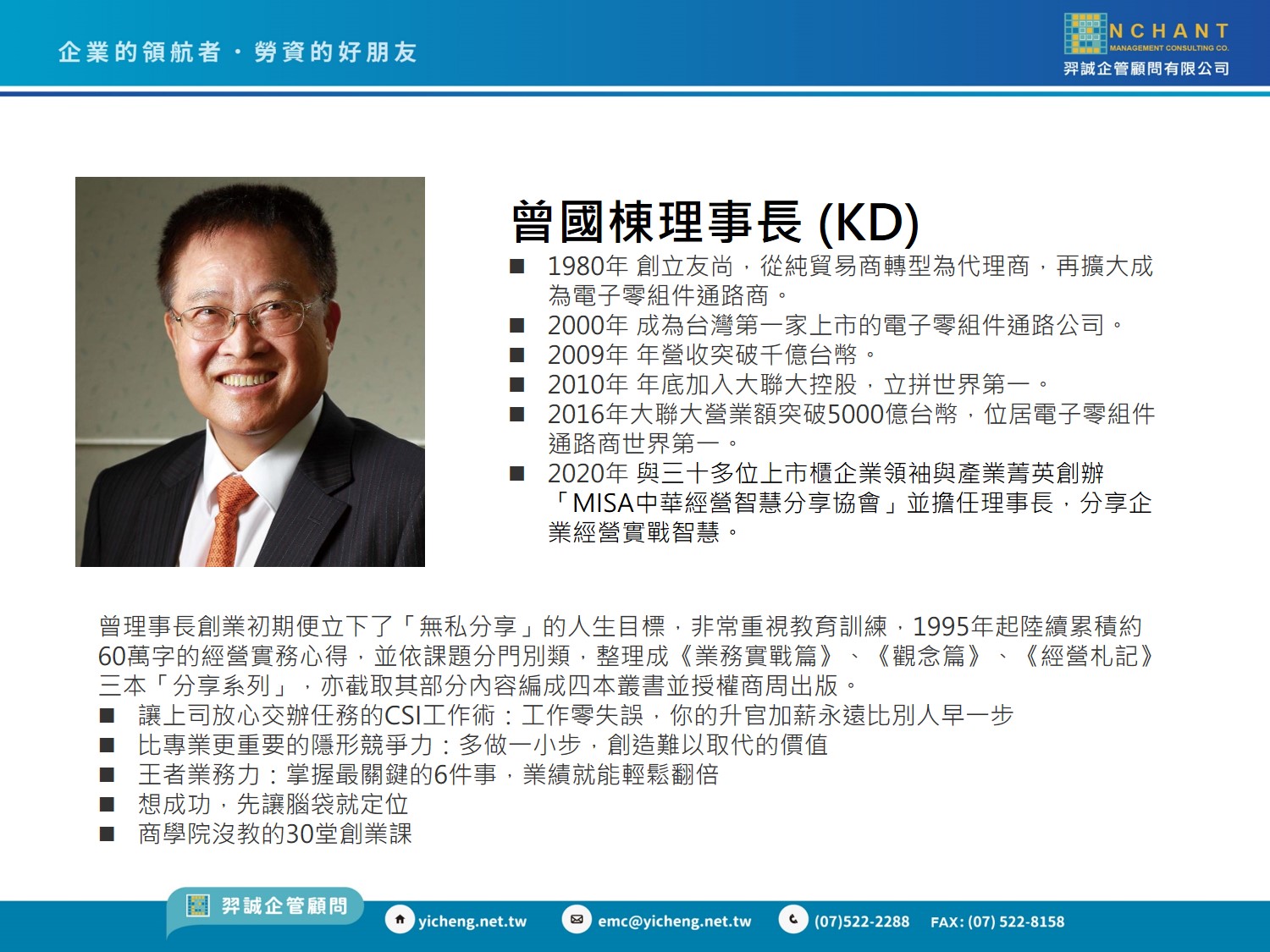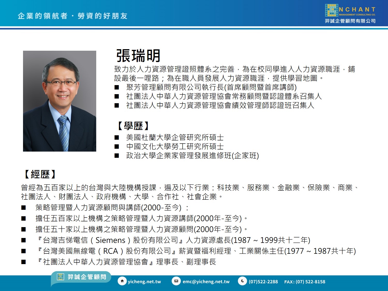 羿誠企管顧問有限公司是由一群結合企業勞動法令、人力資源、財稅規劃、經營管理…等各領域優秀人才所組成的顧問公司,二十幾年來,為企業建立符合勞動法令之公司制度、管理規章以及薪資結構,深獲客戶之信賴與肯定。
